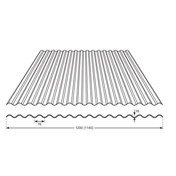 Deze enkelwandige golfplaat van hoogwaardig polyester hars heeft een breedte van 120cm, een werkende breedte van 114 cm en een lengte van 300 cm. Het type golf 76/18 heeft een hoogte van 1,8 cm en een breedte van 7,6 cm.